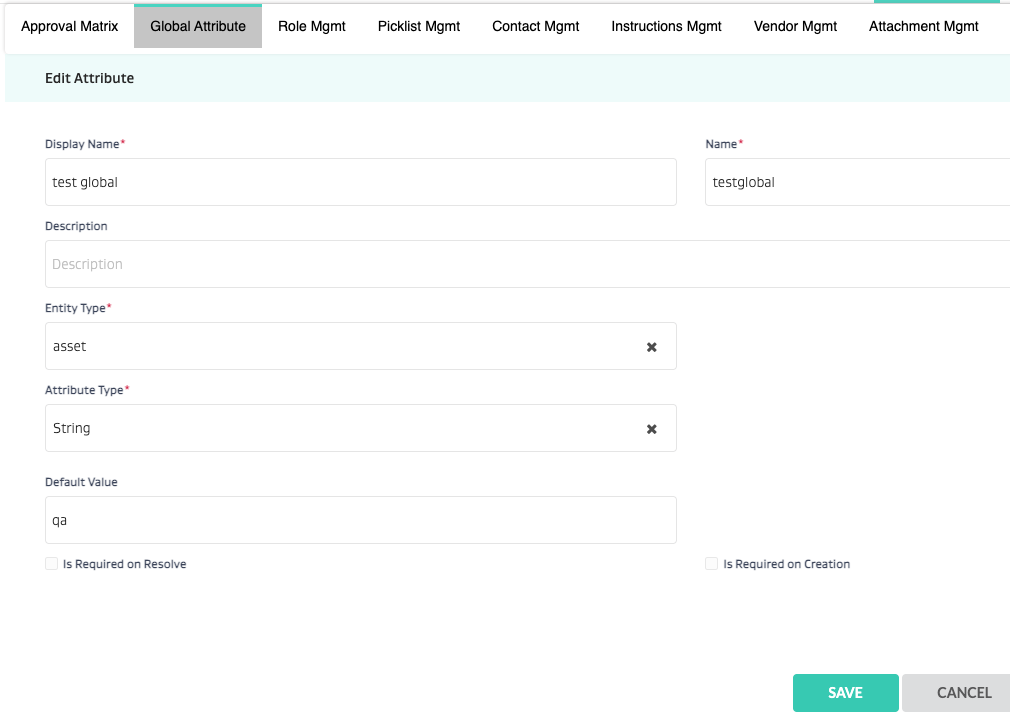 | 1 | Global Attributes (for assets): Go to Global attributes and setup all the attributes you require as Asset entity type global attributes as string or integer. | ![]() |