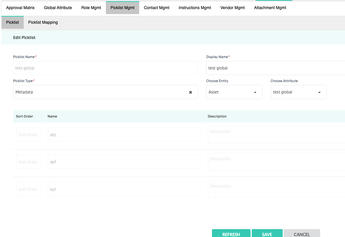 | 3 | Picklist Mgmt: Create a Metadata driven picklist out of each attribute that was setup as a global asset attribute. If this picklist needs to be updated in the future, the admin will have to manually refresh it by coming to this screen. *NOTE: Steps 3, 4, 5 are only required if you want to setup asset metadata to work as a global attribute | ![]() |