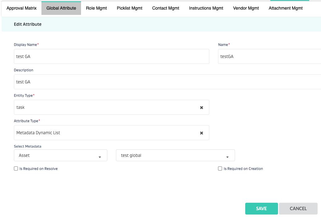 | 4 | Global Attributes (for tasks): Go to Global attributes and setup all the attributes you require as Task entity type global attribute as metadata picklists. *NOTE: Steps 3, 4, 5 are only required if you want to setup asset metadata to work as a global attribute | ![]() |