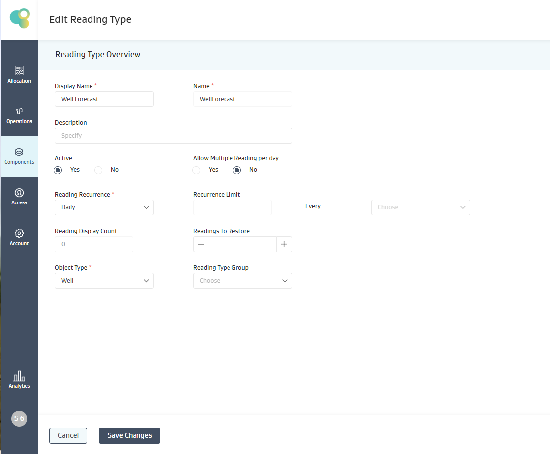 Object Type: This is used to determine, which object types amongst ( well, tank, meter, equipment) will this readings be assigned to. For now, a reading can be made available on only one object-type.