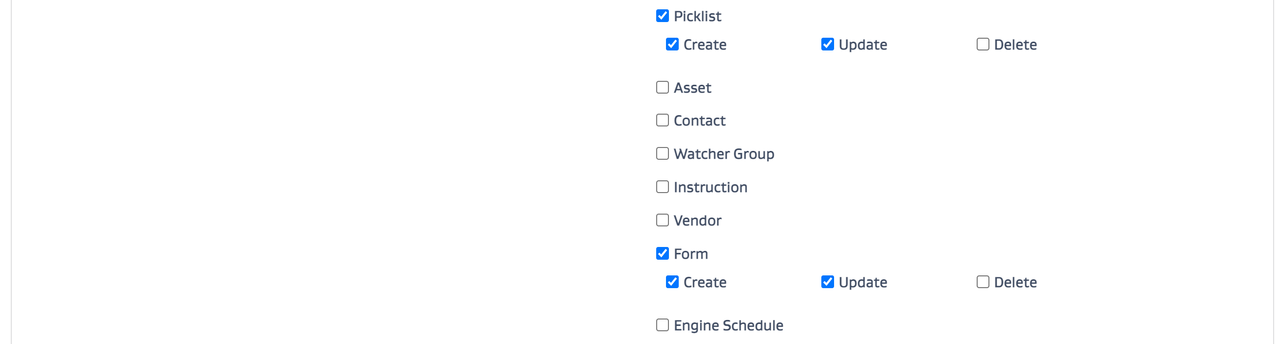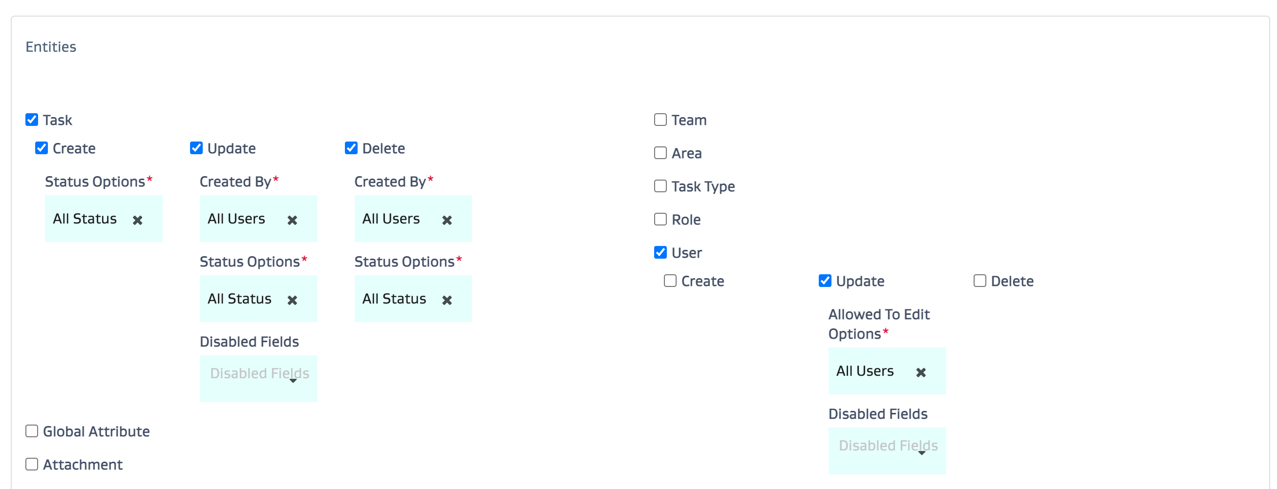 CrUD access: Set up the CrUD access by entity type for the role.