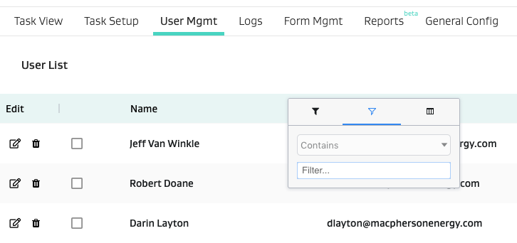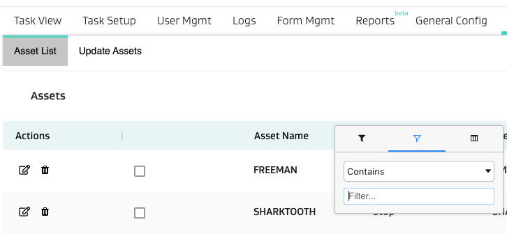 Certain columns in both the Asset List and User List allow you to filter and search.