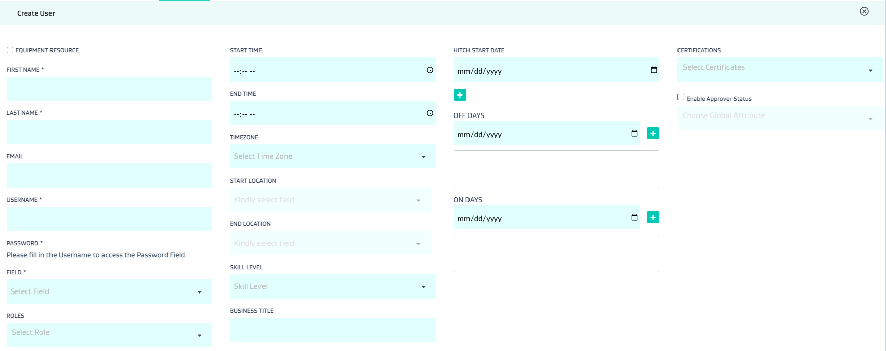1 | Equipment Resource | Check this box if the user is actually meant to be an equipment. This means the user record is actually a crane or a truck. The equipment user doesn’t log in but can be setup to have availability. |