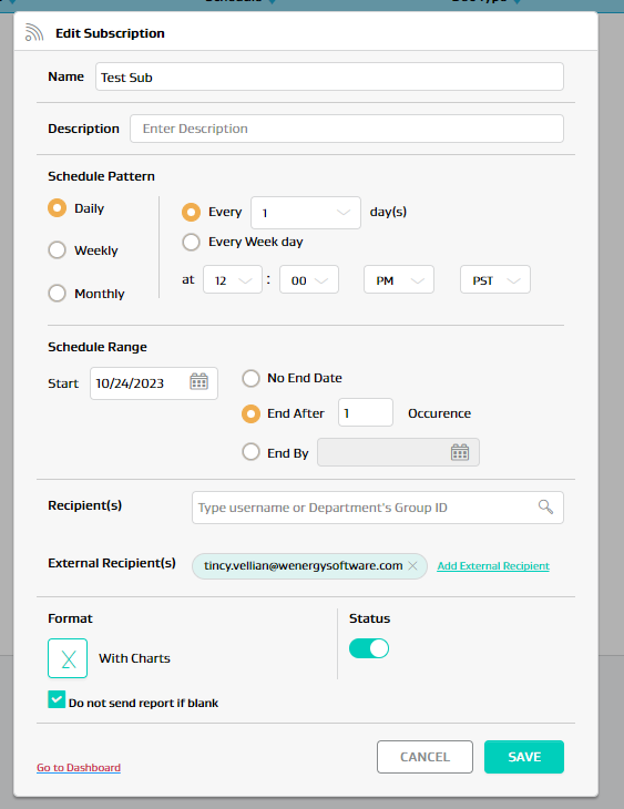 If you want to edit the report/dashboard criteria, then click on the Go to Dashboard link. This will take you to the report/dashboard that is associated to this subscription.
