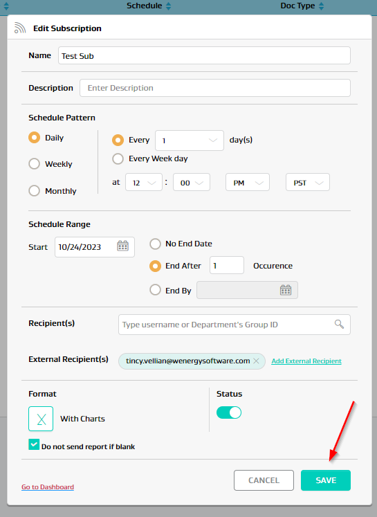 If both subscription and report criteria changes are needed, first update report/dashboard criteria then subscription setting then hit Save.