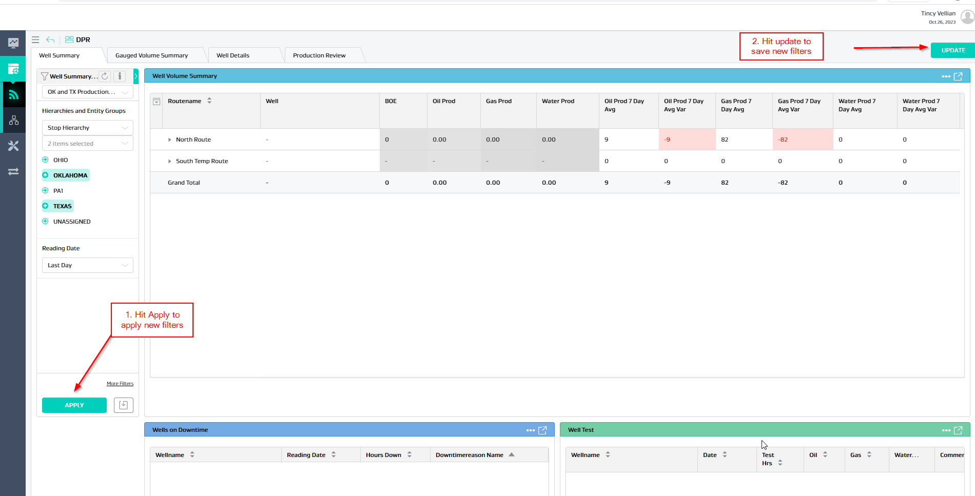 Make the necessary report criteria changes (i.e. filter changes), hit apply and then hit the update button.