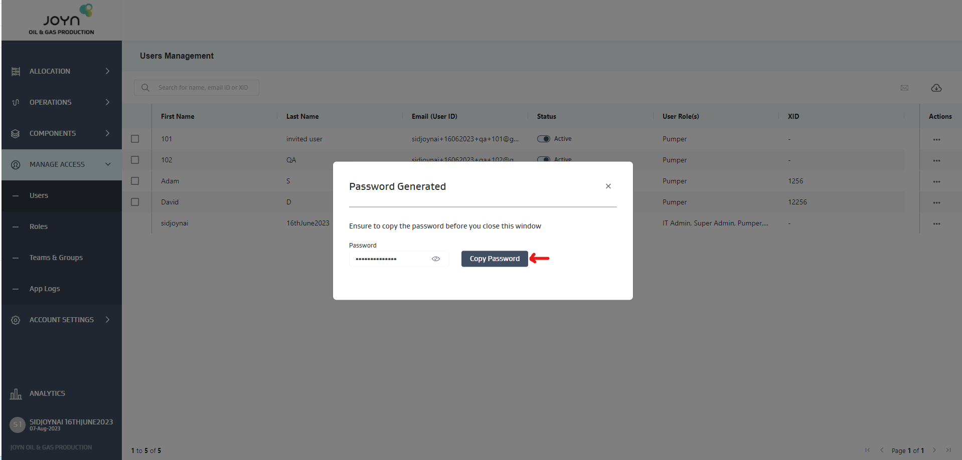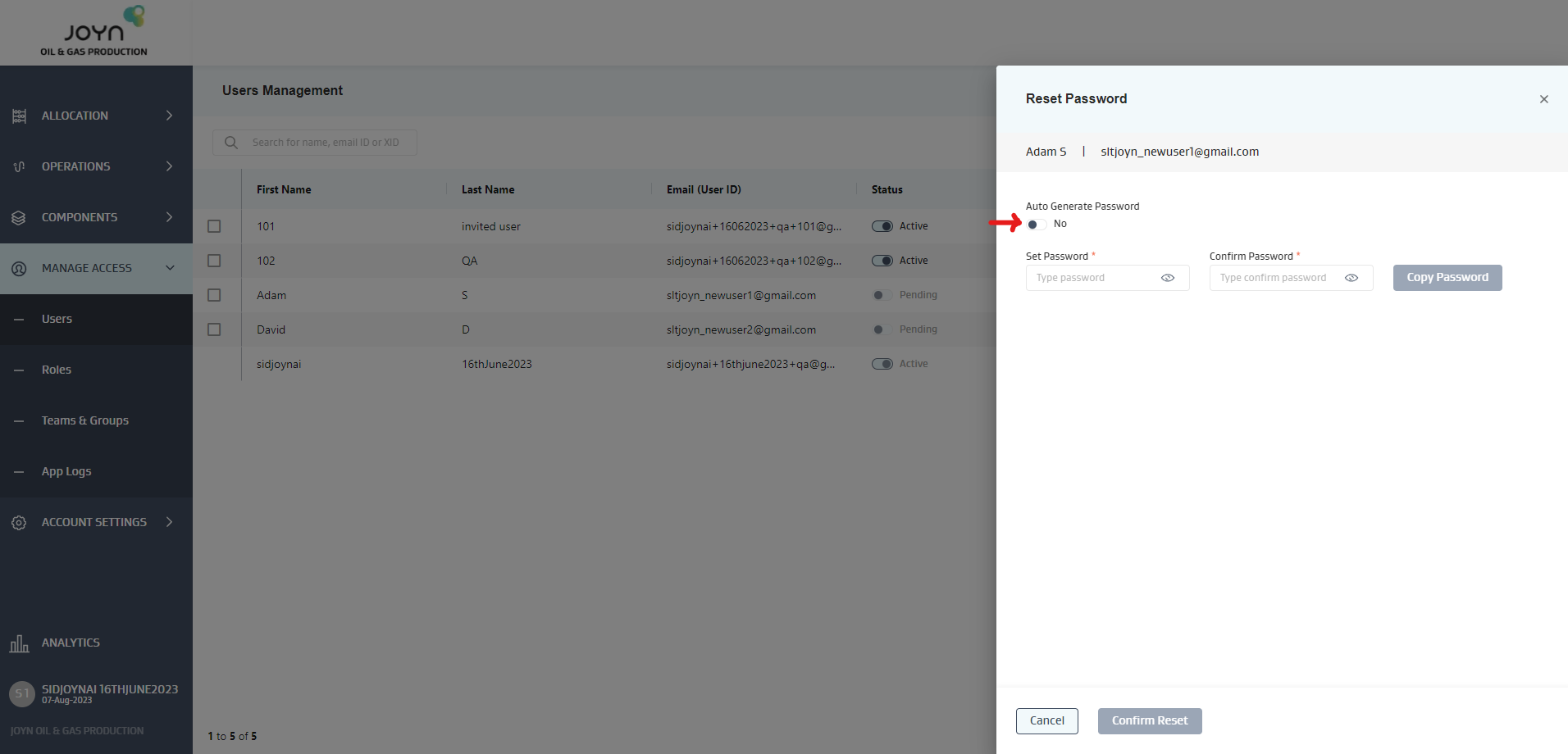Joyn O&G allows the admin to not wait for the users to accept the invitation and signup to use the JoynOG application. Instead, the admin can “set the password” for the user and share the same with them directly.