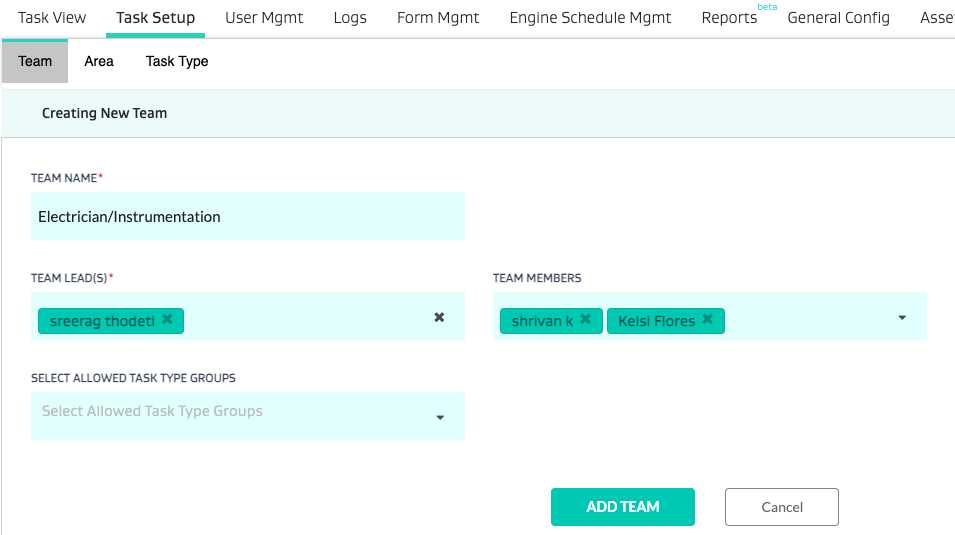 You can add a team under Task Setup>Team