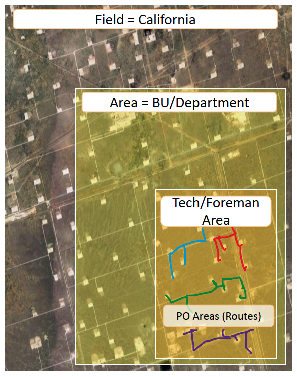 Stop | A geographic location in the field with a lat/long that usually consists of different assets such as wells meters, tanks, and other misc equipment (compressors, pumps, etc) | (for Customer to fill out) | (for customer to fill out) e.g. Lease Operator e.g. Electrical technician or Maint technician |