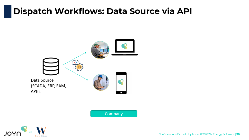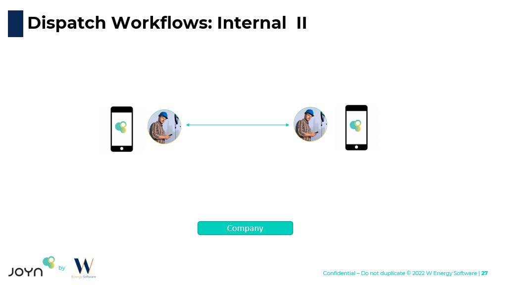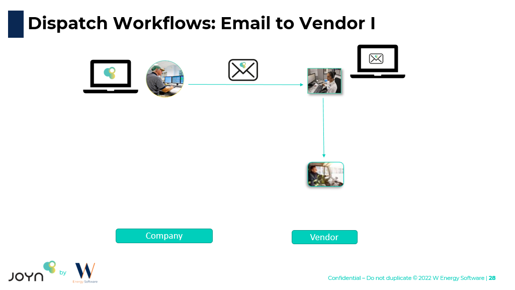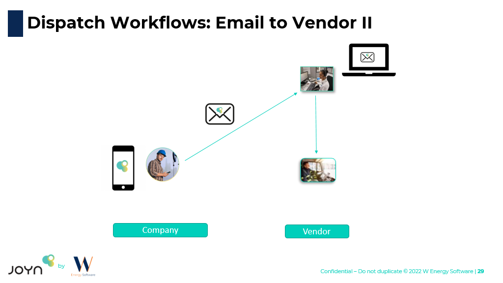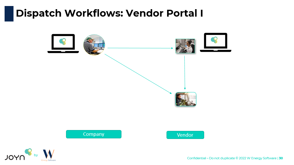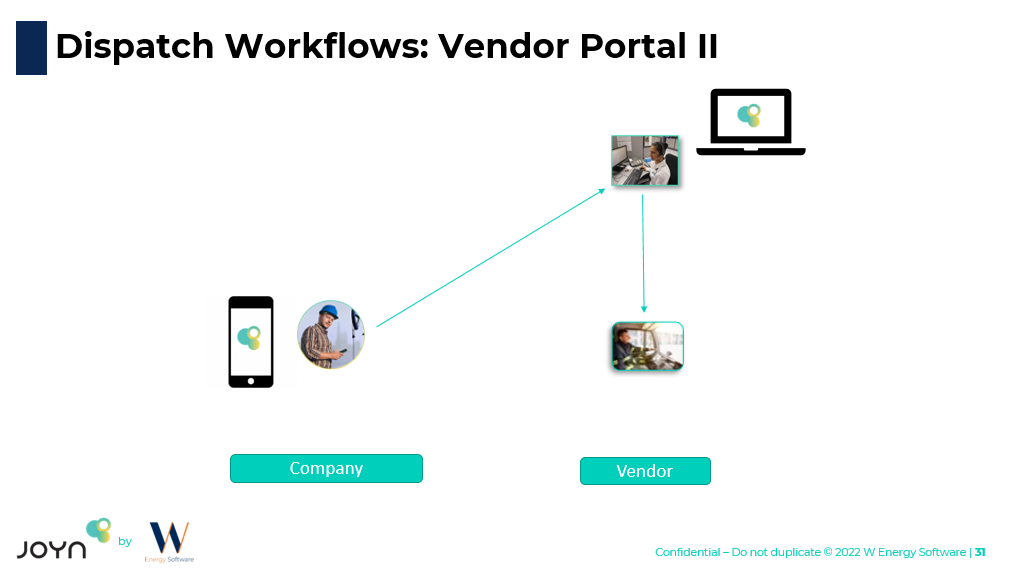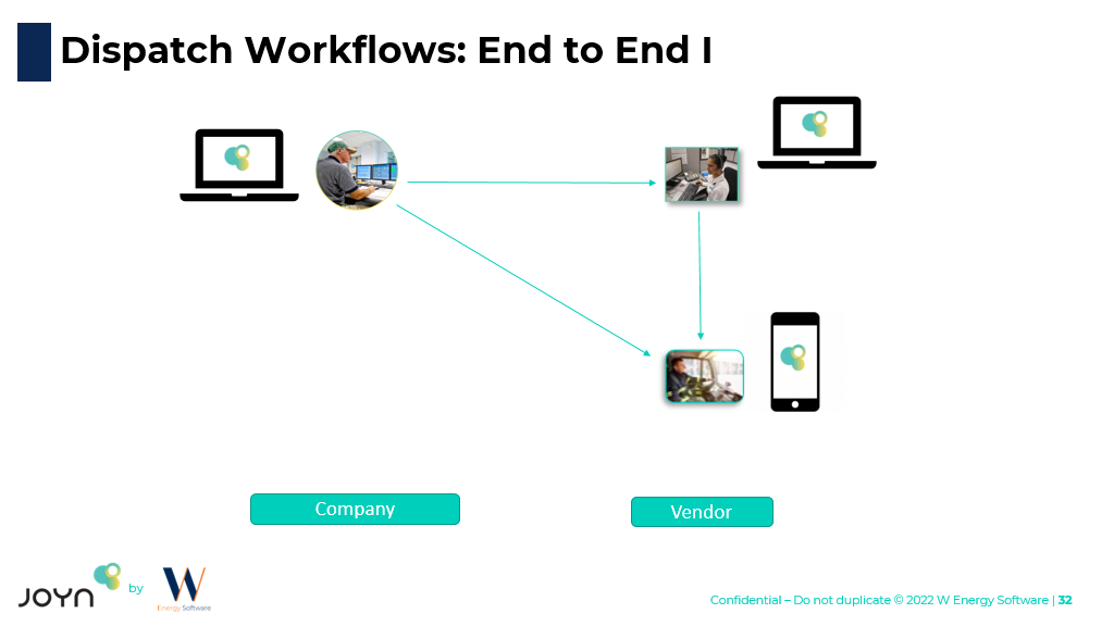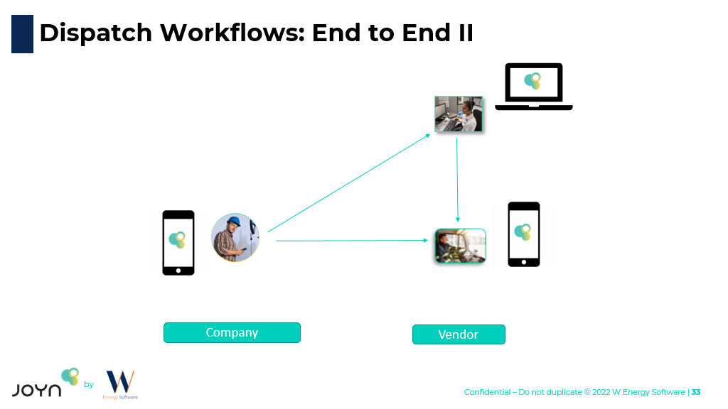 A company dispatcher can dispatch the task to the vendor side dispatcher to dispatch to the vendor employee OR he can dispatch it directly to the vendor employee via the JOYN mobile app that the vendor employee in the field has access to. The vendor side dispatcher would still be able to view this on the web to be on the same page as the company dispatcher.