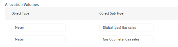 The set up above results in only two (Digital (gas) Gas sales, Gas Odometer Gas sales) meter subtypes considered as volume sources for the sales disposition. Any other meter with a different subtype would not be considered to be a volume source for gas sales.In cases where the object subtype is not defined, the system will consider objects (matched) of all subtypes to be valid volume sources.