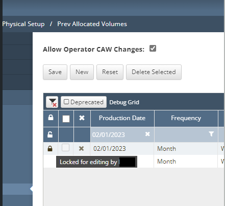 Navigate to Physical Setup - Prev Allocated Volumes screen and look for the lines that have the lock icon on the left. Hover over the lock icon to see which user is currently editing the line item.