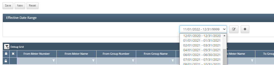 Must have a start date on or after the start date of the meter/well/group effective dates for the records to appear in pick lists on this screen later.